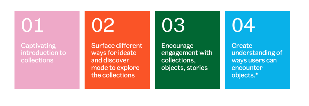 Together, we revisited the goals of Explore the Collections and redefined the role of the landing page within that ecosystem. We agreed – the landing page for Explore the Collections should: