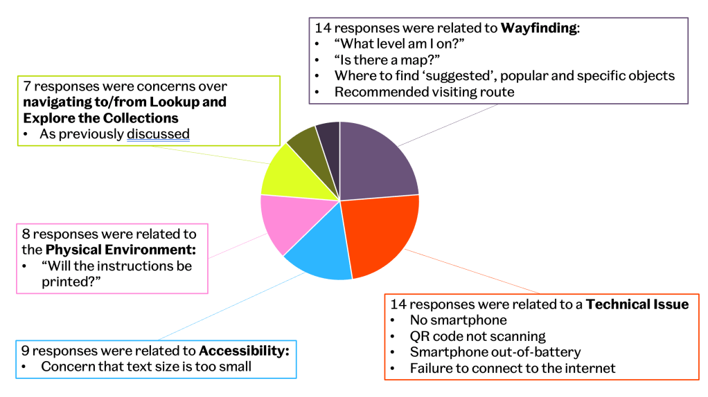 To test usability before launch, we conducted a moderated qualitative study. As the Storehouse was still under construction, we recreated it in a large meeting room at the V&A in South Kensington, using printed images of displays to simulate the visitor journey. We tested with newly recruited Front of House staff, representing first-time visitors, to understand how people would discover and use Lookup in context. Here are some of the concerns that came out from findings (put together by our UXRer Will Cash):