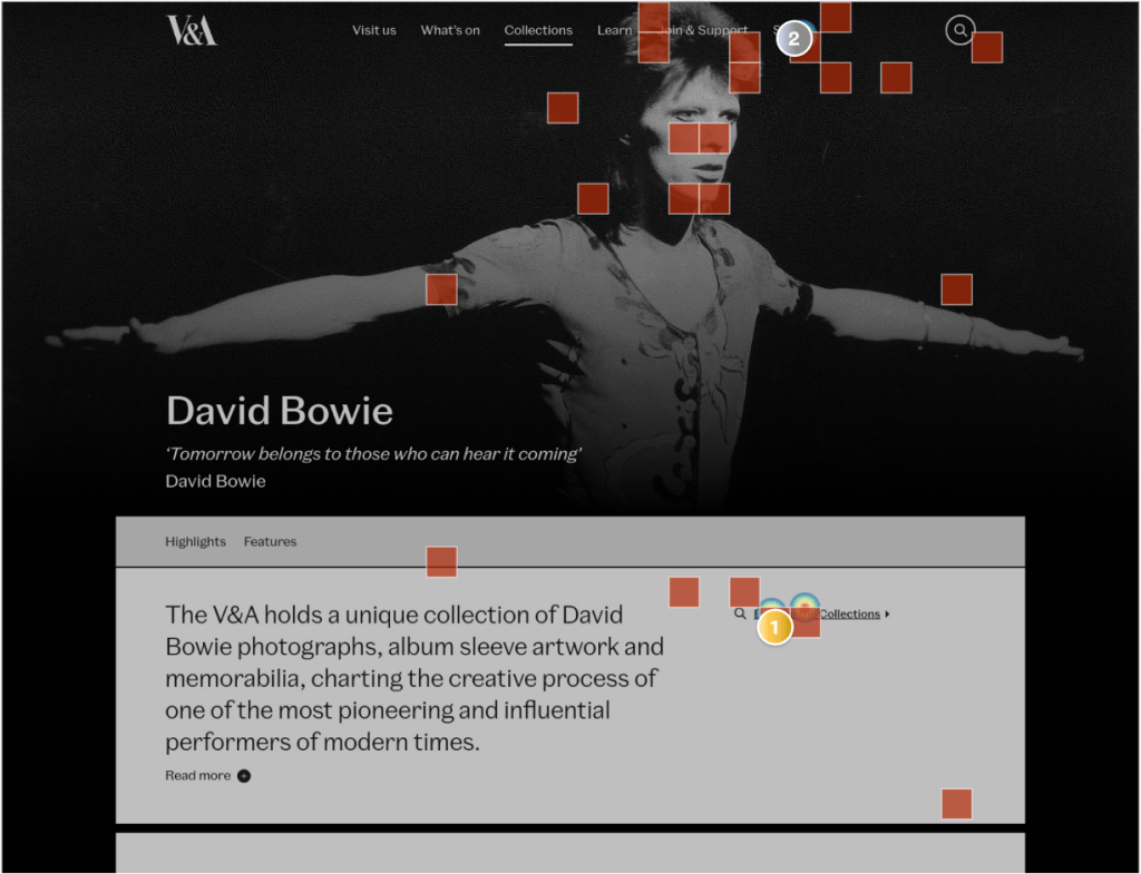 Using the momentum of the opening of the David Bowie Centre in September 2025, I used Bowie as a thought experiment to test how a visitor might explore a topic on the V&A website. A search for David Bowie from a search engine would feature the David Bowie From the Collections page in the top 4 organic search results. These pages performed really well in search already, the V&A has great search authority and great SEO equity.
