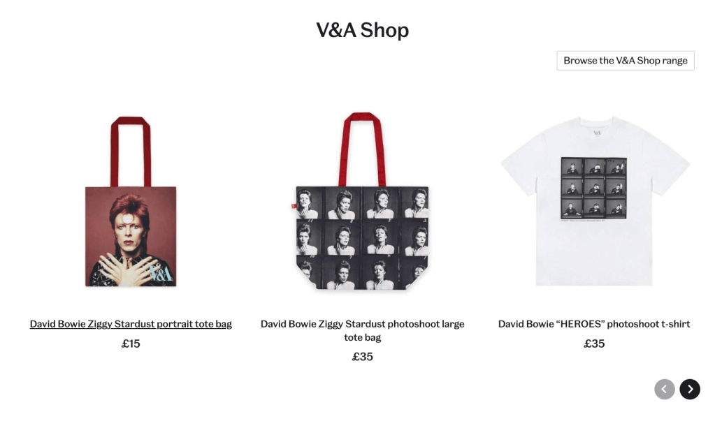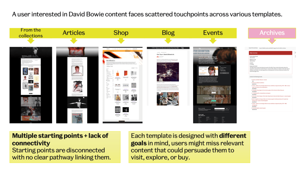 Internally, we began referring to this gap as the “Bowie Challenge.” In theory, a visitor should be able to find a wide range of Bowie-related material easily. In practice, there was no straightforward path between relevant From the Collections pages, Explore the Collections search, the Archives, or the Shop from a google search to the V&A website.