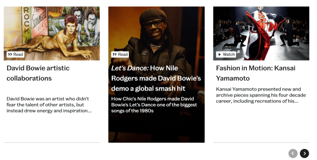This “Bowie Challenge” became shorthand for a broader problem: the site wasn’t connecting its content meaningfully. It highlighted how thematic pages functioned as silos rather than as part of an interconnected discovery layer. The refresh therefore set out to transform From the Collections into a network of editorially guided starting points, places where stories, objects, and ideas could link naturally, helping users follow their curiosity across the breadth of the V&A’s holdings.