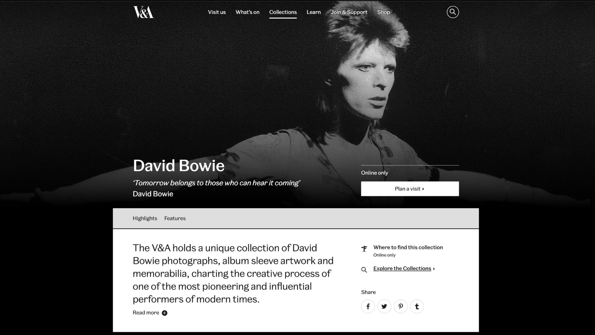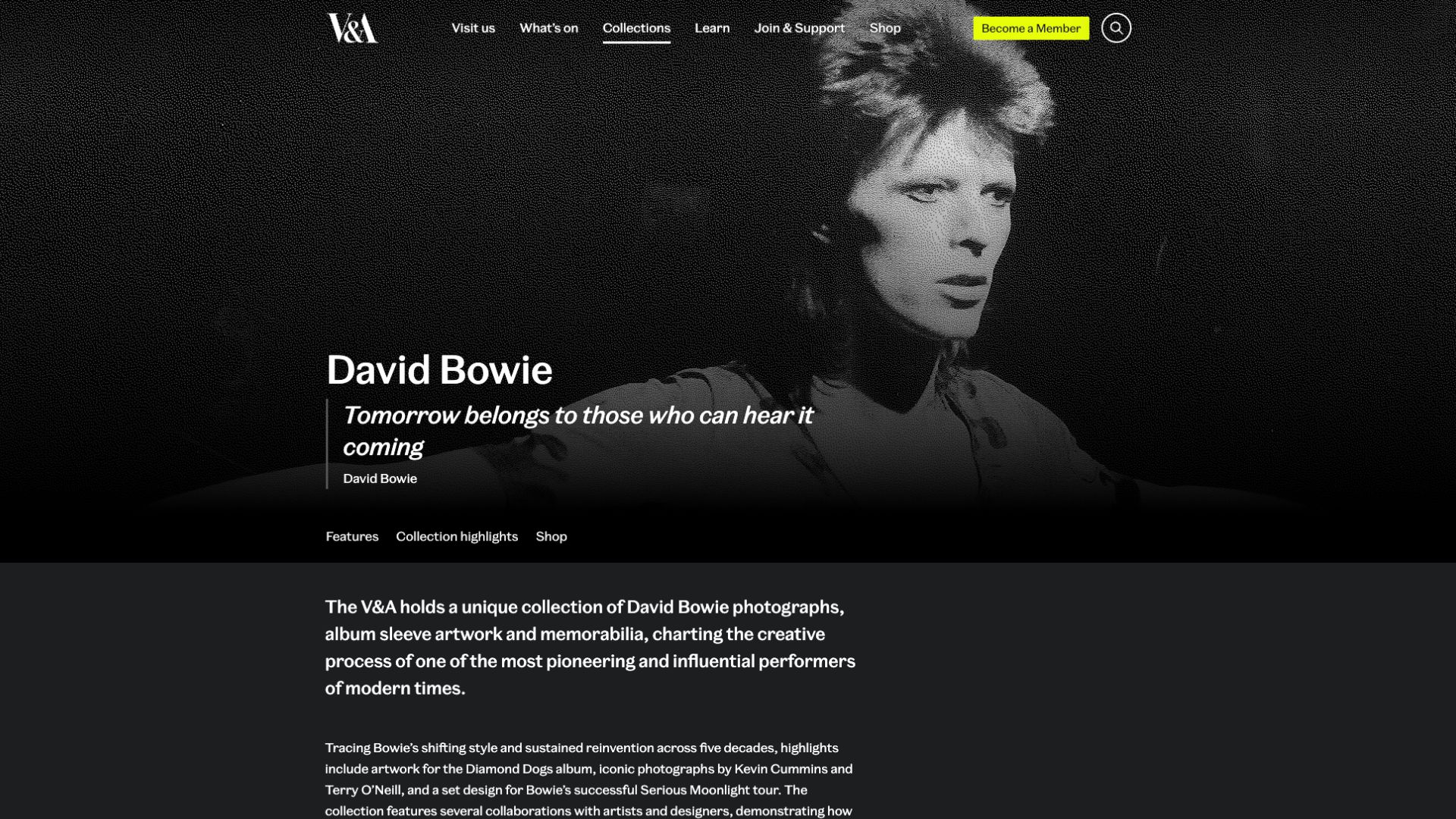 As Product Manager, I framed the “Bowie Challenge” as an opportunity to evolve From the Collections from a set of themed highlights into an interconnected discovery experience that made better use of the V&A’s rich offer. From discovery and cross-team workshops, I defined a set of product principles to guide design and content decisions for the refresh. These principles ensured the From the Collections pages not only looked cohesive but functioned as a connected, scalable discovery layer across the site.
